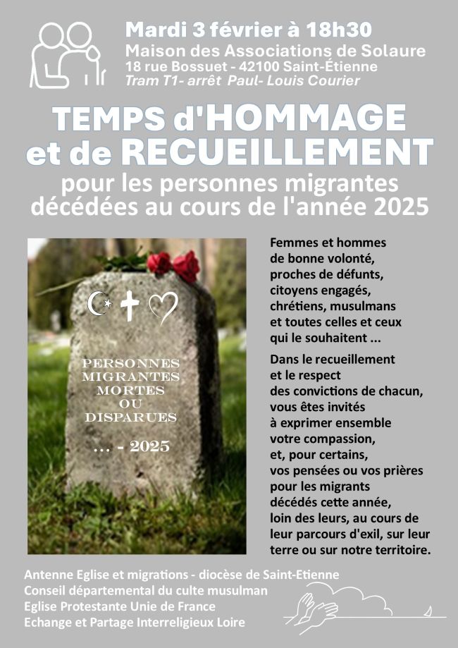Des hommes, des femmes et des enfants ne sont jamais parvenus au terme de leur voyage d’exil vers une vie meilleure : ils sont des milliers dans le grand cimetière de la Méditerranée ou celui de la Manche ou dans le désert du Sahara ou dans la traversée des Alpes. D’autres sont morts ici, dans notre région ligérienne sans pouvoir être accompagnés par les leurs, restés dans leur pays d’origine.