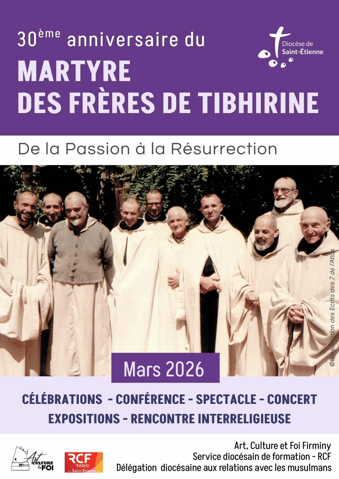 Du 1er mars au 12 avril 2026, dans le cadre de la célébration du 30 ème anniversaire du martyre des frères de Tibhirine, Art, Culture et Foi Firminy, le service diocésain de formation , RCF -Saint-Étienne, et la délégation diocésaine aux relations avec les musulmans proposent un programme riche et varié pour honorer la mémoire des moines.