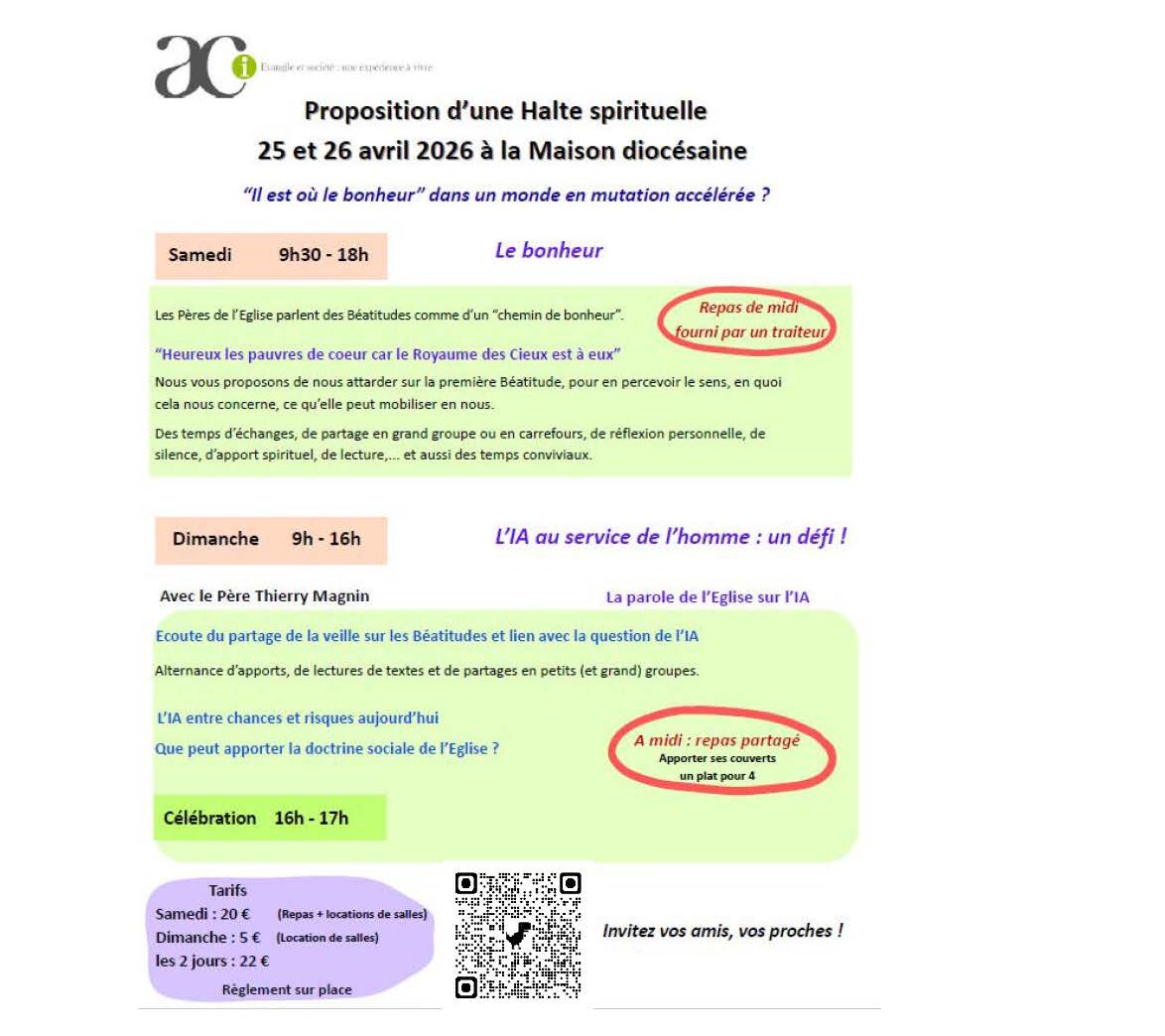 L’Action Catholique des milieux Indépendants propose une halte spirituelle, ouverte à tous, les 25 et 26 avril 2026 à la maison Diocésaine .