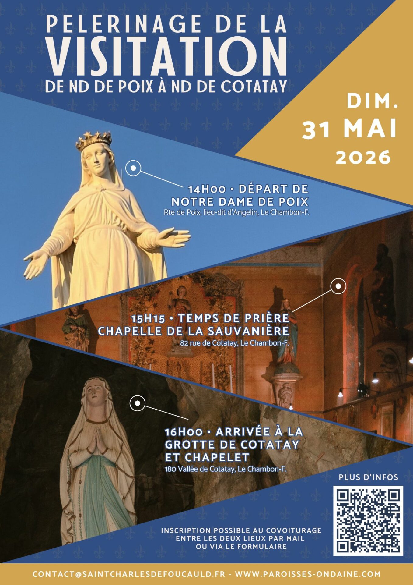 Temps de prière au pied de la Madone ND de Poix (Route de Poix, lieu-dit d’Angelin au Chambon-Feugerolles) puis départ de la marche vers la Grotte de Cotatay. Accessible à tous (4,7 km avec pauses). Parking possible à proximité (places limitées) ou vers la piscine du Chambon-Feugerolles.