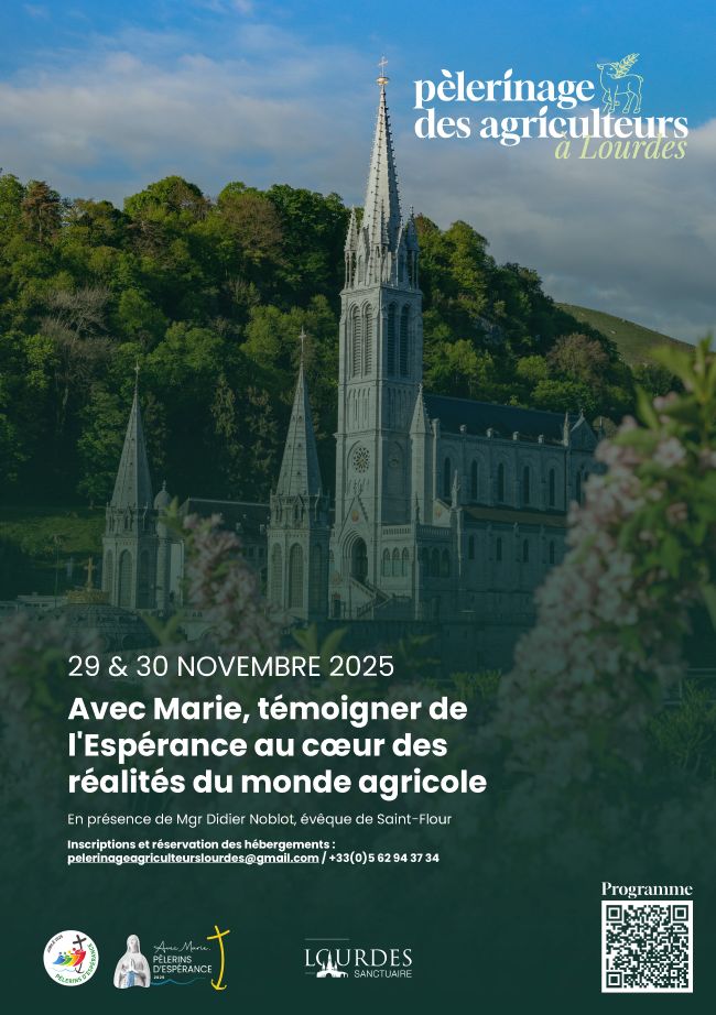 Les 29 et 30 novembre, le Sanctuaire de Lourdes accueille la deuxième édition du pèlerinage national des agriculteurs. Ce pèlerinage est présidé par Mgr Noblot, évêque de Saint-Flour et accompagnateur des réalités du monde agricole au nom de la Conférence des Évêques de France, et soutenu par Mgr Jean-Marc Micas, évêque de Tarbes et Lourdes.