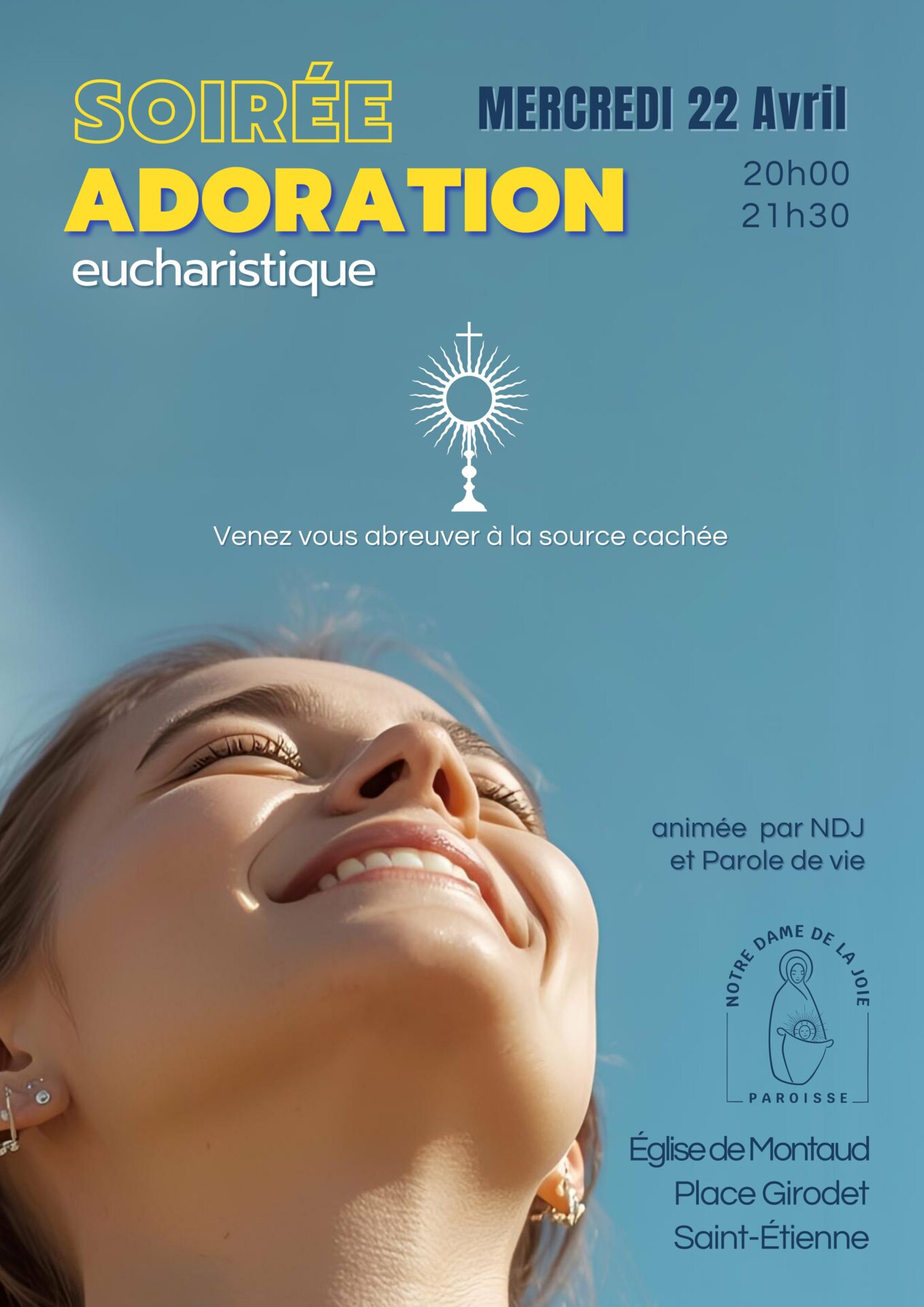 La paroisse Notre Dame de la joie et le groupe de prière Parole de Vie vous invitent à une soirée d’adoration eucharistique rythmée par des chants de louanges et méditation. Un temps de ressourcement pour déposer ses fardeaux et retrouver des forces dans la présence du Seigneur.