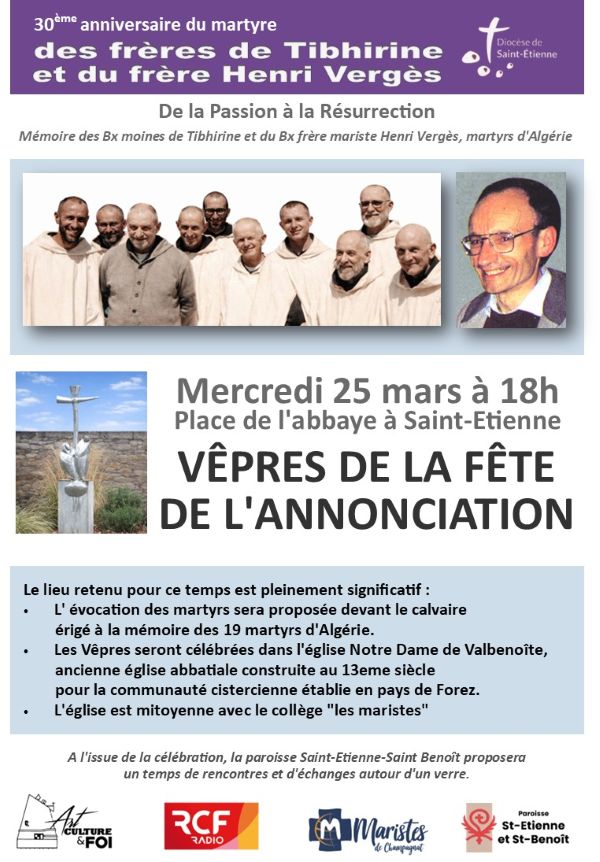 Du 1er mars au 12 avril 2026, dans le cadre de la célébration du 30 ème anniversaire du martyre des frères de Tibhirine, Art, Culture et Foi Firminy, le service diocésain de formation , RCF -Saint-Étienne, et la délégation diocésaine aux relations avec les musulmans proposent un programme riche et varié pour honorer la mémoire des moines.