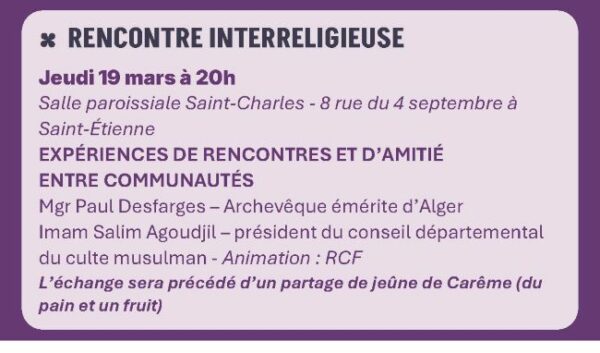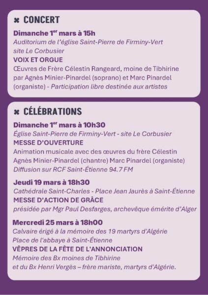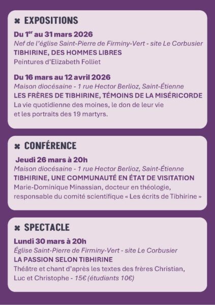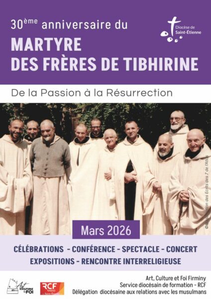 Du 1er mars au 12 avril 2026, Art, Culture et Foi Firminy, le service diocésain de formation , RCF et la délégation diocésaine aux relations avec les musulmans vous proposent un programme riche et varié pour honorer la mémoire des moines !