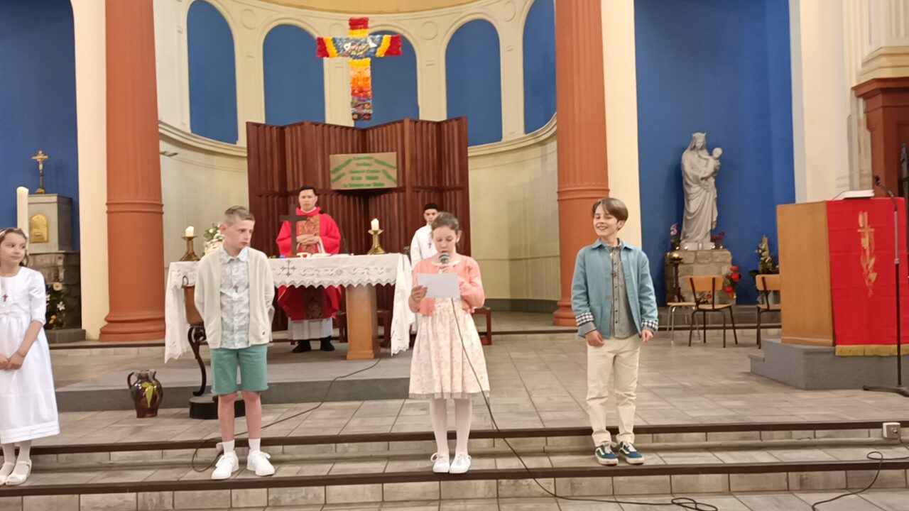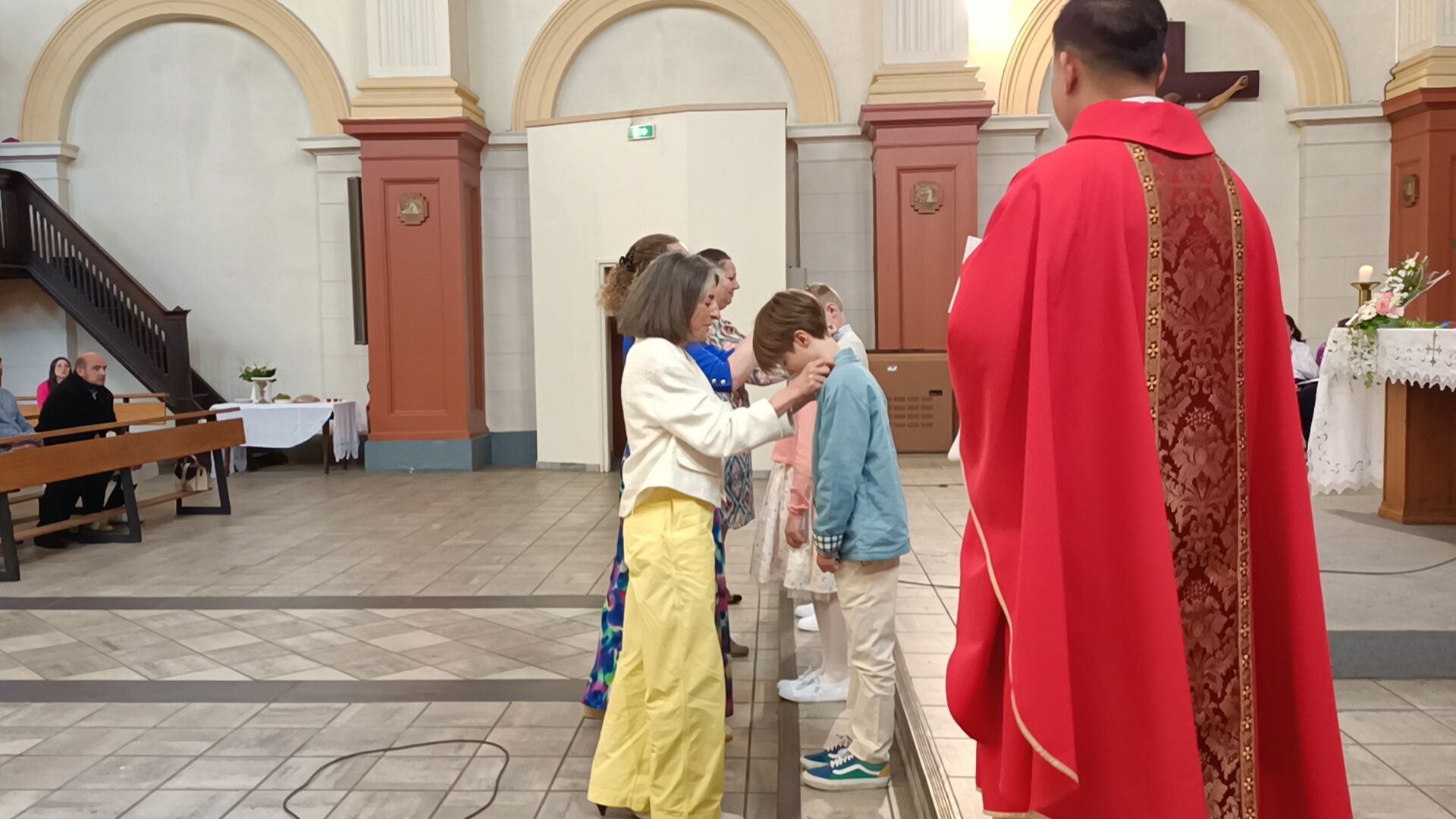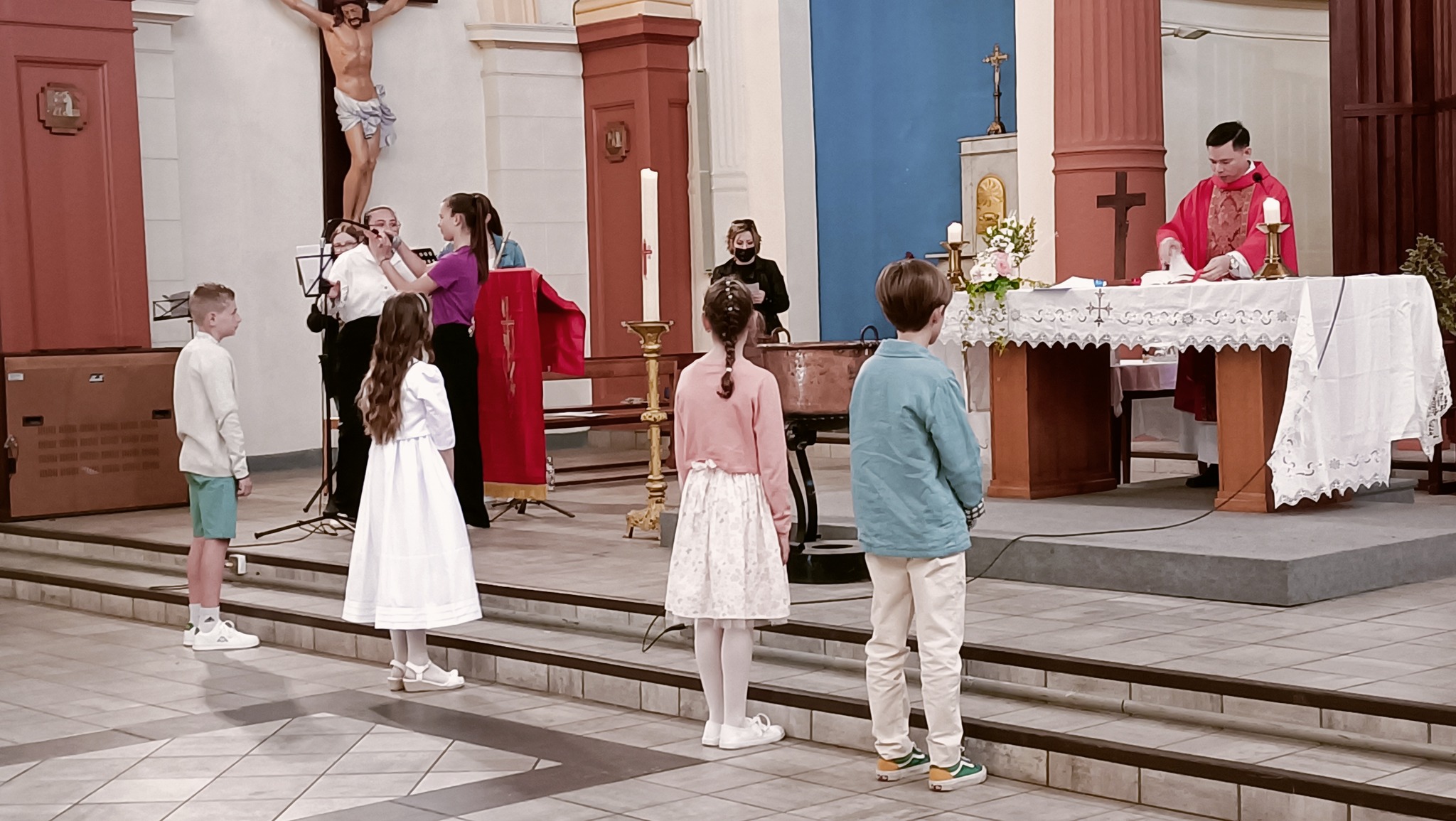 Dimanche 19 mai, dimanche de Pentecôte, Antoine, Soline, Léandre et Clarisse ont communié pour la première fois en l’église Notre-Dame de Lorette.
