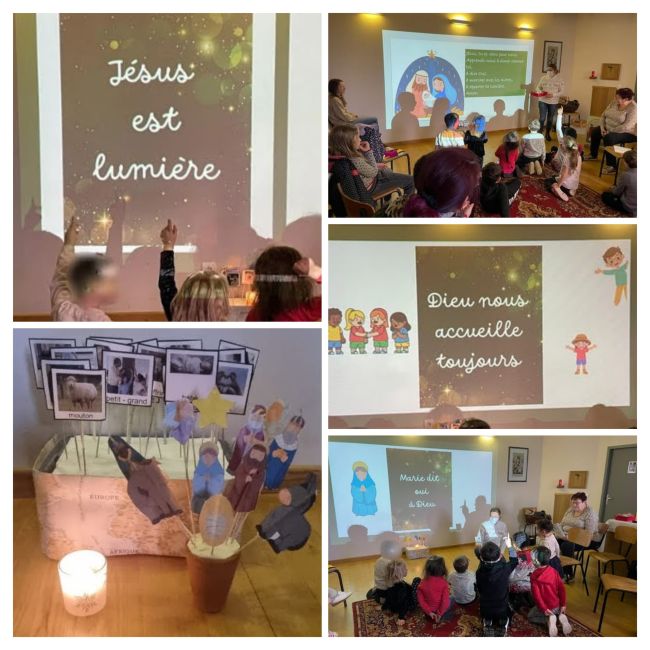 Samedi 20 décembre, les enfants de l’Éveil à la Foi sont venus écouter la merveilleuse histoire de la naissance de Jésus ils ont découvert des mots comme : service, accompagner, aider, aimer… accompagnés par toute une équipe : Pauline, Eric, Katy, Martine, Yvette, Élisabeth.
