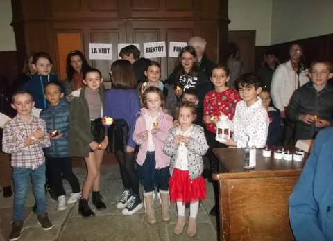 La messe de la veillée de Noël était à 18h . Guidés par le père Bernard Tordi,  parents et enfants sont venus dire à la communauté : « La nuit est bientôt finie ». Les enfants avec leurs lumières sont devenus les éclaireurs pour nous annoncer : « Voici le temps de la promesse » et nous conduire vers la crèche : « Je vous annonce une bonne nouvelle ». La crèche, quoique bien éclairée n’était pas visible de tous. Ce sont encore les enfants qui ont distribué la bonne nouvelle avec le dessin de la crèche. La trompette d’Aurélien, et les chants ont accompagné, dans la joie, notre célébration. Des mamans nous ont rappelé : L’enfant Dieu, emmailloté et couché dans une crèche devient signe : Signe du plus pauvre, signe de la main tendue, signe du sourire partagé.